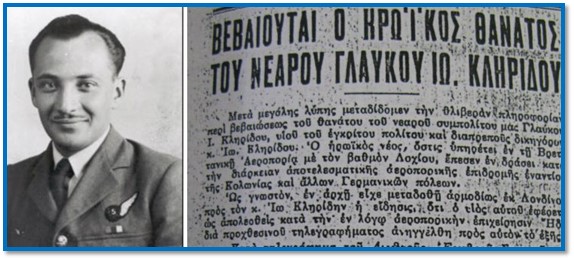 Ο Γλαύκος Κληρίδης (1942) με τη στολή Λοχία [(Ιπταμένου)- Flight Seargent] της RAF και απόκομμα εφημερίδος εποχής που τον αναφέρει ως νεκρό.