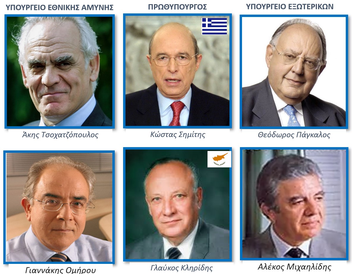 Ο Γλαύκος Κληρίδης[8] (1919-2013) ήταν Πρόεδρος της Κυπριακής Δημοκρατίας και Υπουργός Εθνικής Αμύνης ο Γιαννάκης Ομήρου. Στην Ελλάδα ο Πρωθυπουργός Κώστας Σημίτης[9] (1936-2025) διάνυε το δεύτερο έτος της θητείας του, μετά τη νίκη του στις εκλογές του Σεπτεμβρίου του 1996. Ο Θεόδωρος Πάγκαλος[10] (1938-2023) ήταν Υπουργός Εξωτερικών (στις 19 Φεβρουαρίου 1999 τον διαδέχθηκε ο Γεώργιος Παπανδρέου) ενώ ο Άκης Τσοχατζόπουλος[11] (1939-2021) προΐστατο του Υπουργείου Εθνικής Αμύνης.
